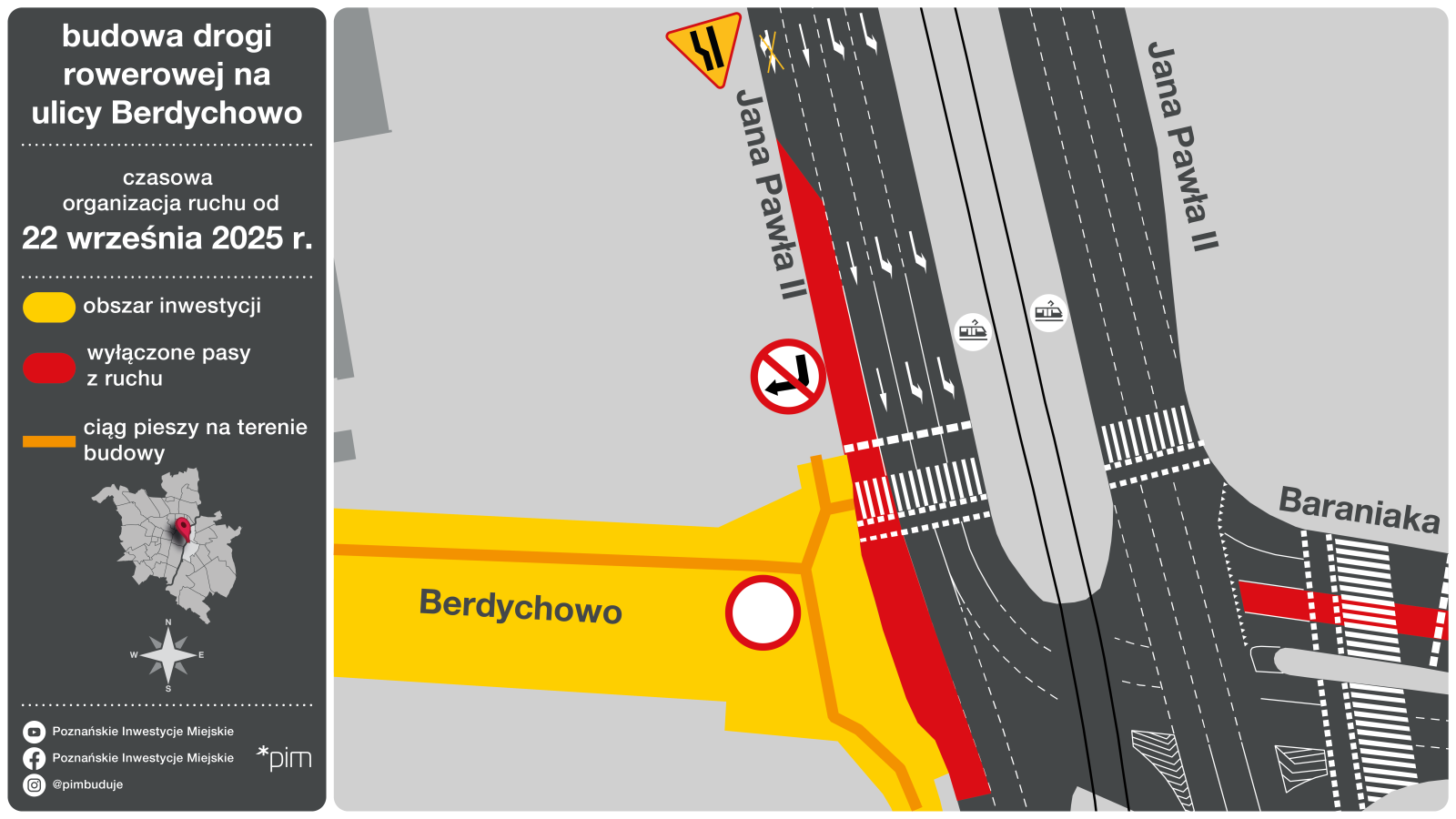 Od 22 września (poniedziałek) prowadzone będą prace związane z nawierzchnią ul. Berdychowo przy skrzyżowaniu z ul. Jana Pawła II. Na czas prac konieczne będzie tymczasowe wygrodzenie skrajnego, służącego do jazdy na wprost, pasa ul. Jana Pawła II na jezdni prowadzącej w kierunku ronda Rataje. Wygrodzenie będzie dotyczyło odcinka jezdni w rejonie skrzyżowania z ul. Berdychowo. Prace prowadzone będą poza godzinami szczytu komunikacyjnego, by utrudnienia były możliwie jak najmniej dotkliwe. Wykonawca po zakończeniu robót będzie więc przywracał ruch na wyłączonym pasie.