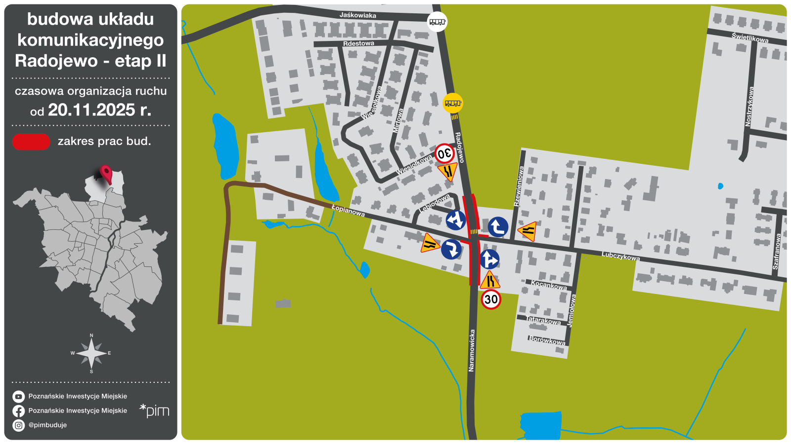Zmiana organizacji ruchu umożliwiająca przejazd bez wahadła wprowadzona zostanie w czwartek w godzinach porannych. Ruch w ciągu ul. Radojewo i Naramowickiej w relacji północ-południe będzie możliwy po jednym pasie w każdym kierunku, tor jazd może się jednak zmieniać w zależności od trwających prac na poboczach. Utrzymane zostaną nakazy skrętu w prawo z ulic Lubczykowej i Łopianowej. W dalszym ciągu obowiązywać będzie ograniczenie prędkości do 30 km/h. Prosimy o zachowanie ostrożności w rejonie prac i stosowanie się do oznakowania.