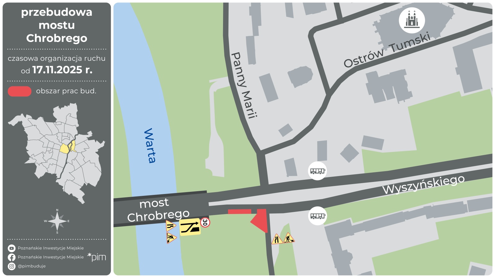Z kolei zmiana obowiązująca od 17 listopada na skrzyżowaniu ul. Wyszyńskiego i Wieżowej jest konieczna ze względu na prace dotyczące budowy kanalizacji deszczowej. Na krótkim odcinku jezdni ul. Wyszyńskiego prowadzącej w stronę ronda Śródka, między mostem Chrobrego a ul. Wieżową, wstępować będzie czasowe zawężenie do jednego pasa ruchu. Nie będzie to jednak stałe zajęcie zewnętrznego pasa. W zależności od fazy prac, wykonawca będzie udostępniał oba pasy ul. Wyszyńskiego w tym miejscu. Prędkość zostanie ograniczona do 30 km/h.