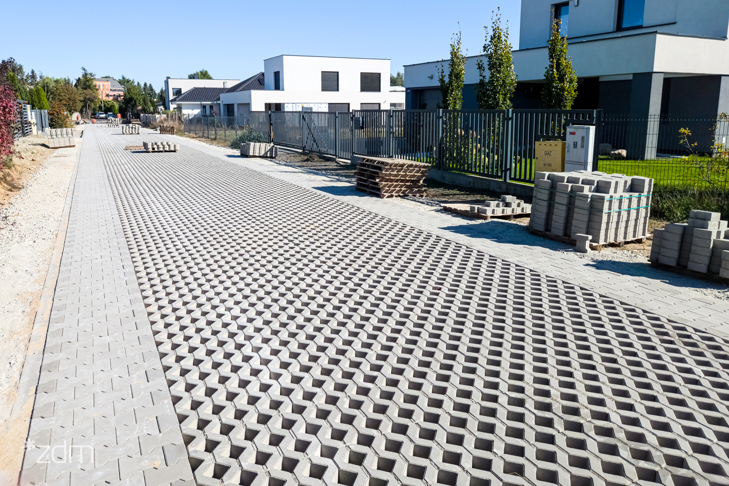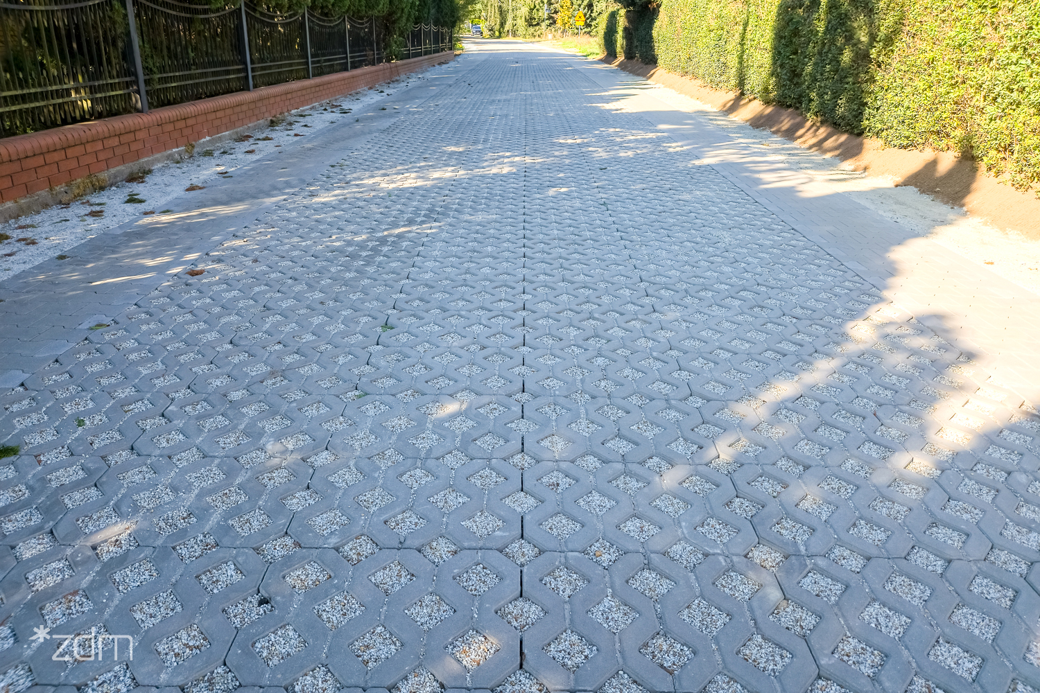 Zgodnie z przyjętymi założeniami, droga zyskuje utwardzenie na szerokości 5 metrów. Środkowa część o długości 3,6 metra wykonywana jest z betonowych płyt ażurowych. Po zewnętrznych stronach układane są pasy z kostki betonowej o szerokości 70 centymetrów, które ułatwiają poruszanie się pieszym i rowerzystom.