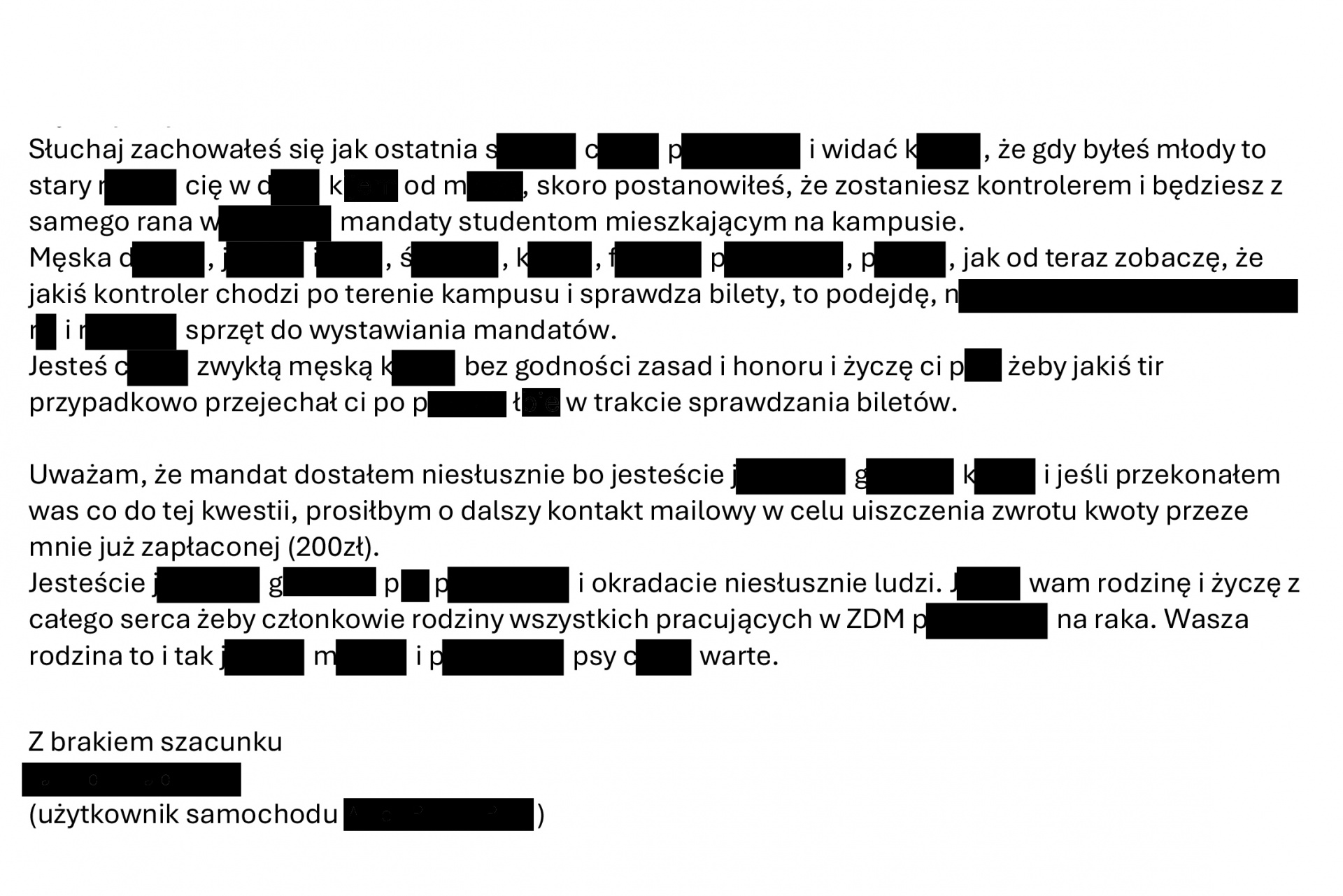 Do ZDM wpłynęła wiadomość napisana przez studenta poznańskiej uczelni, w związku z wystawionym wezwaniem do uiszczenia opłaty dodatkowej za nieopłacone parkowanie w Strefie Płatnego Parkowania. Jednak zamiast standardowego odwołania lub prośby o wyjaśnienie sytuacji, korespondencja zawierała wulgarne treści i groźby przemocy wobec pracowników ZDM.