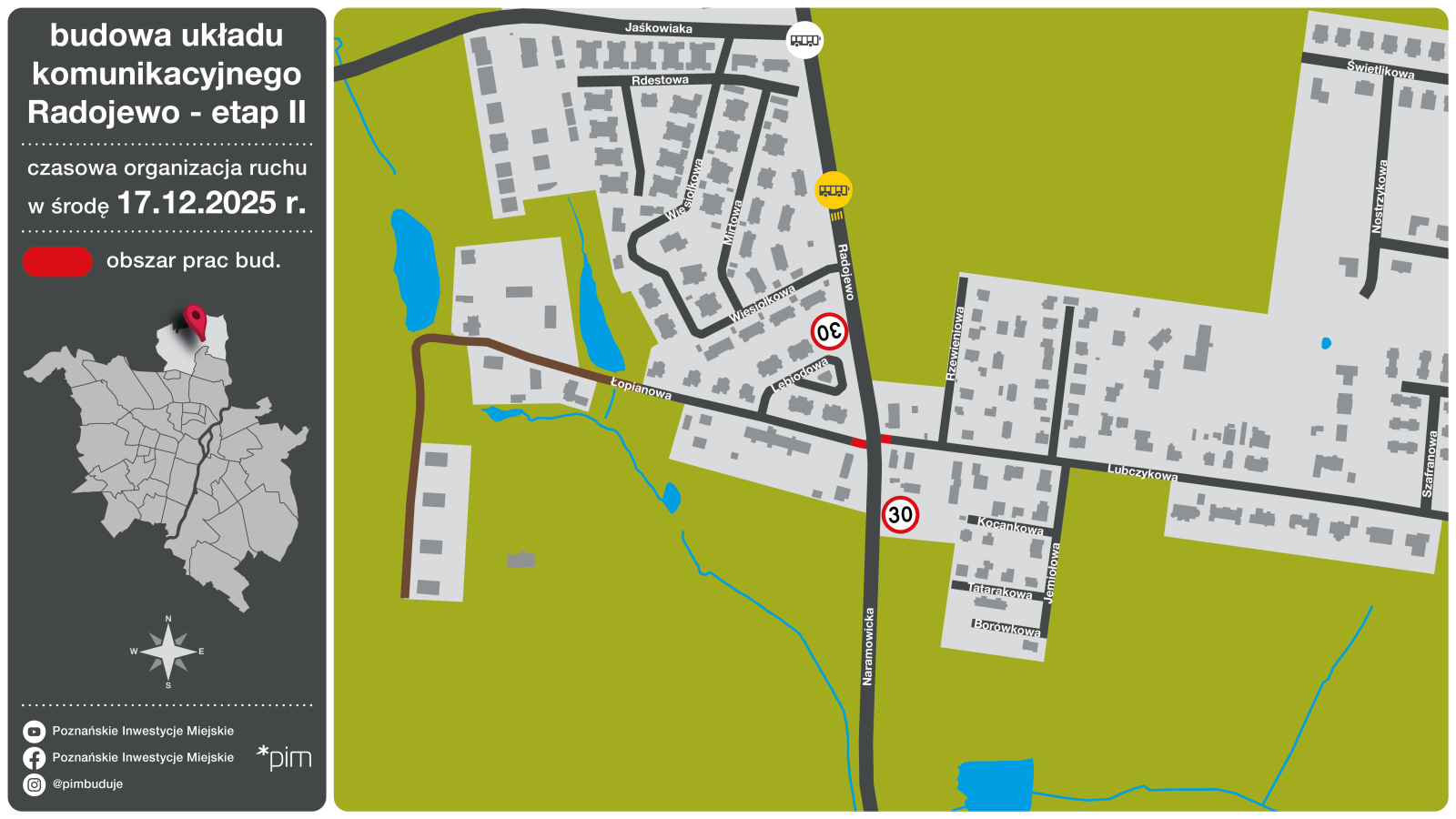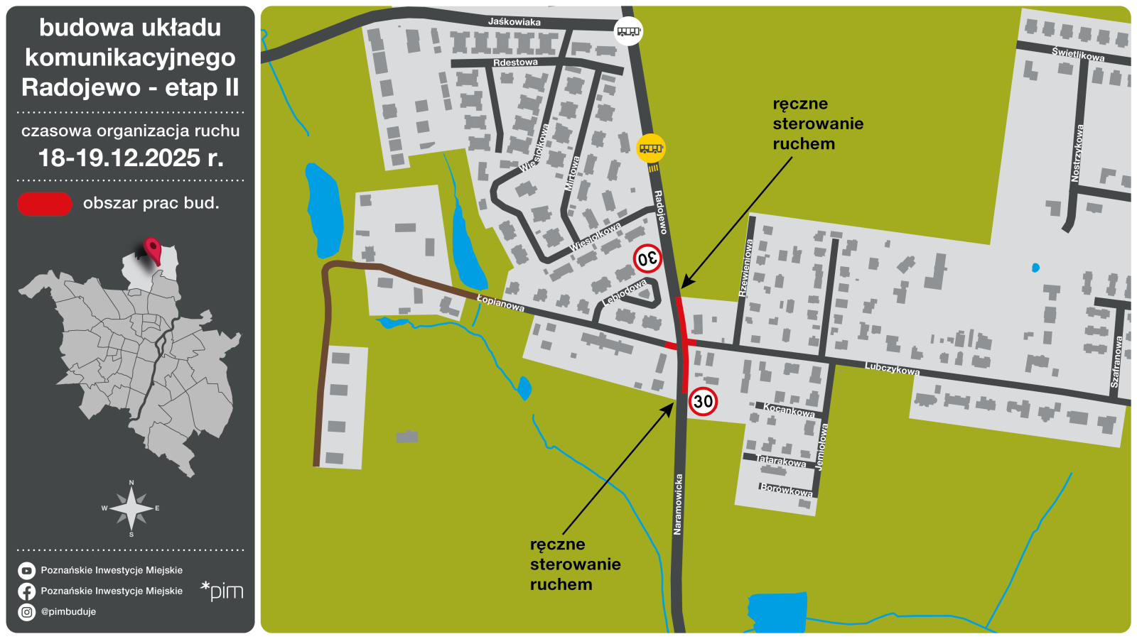 W środę Wykonawca skoncentruje się na ułożeniu warstwy wiążącej nawierzchni na ulicy Lubczykowej i Łopianowej, a w czwartek i piątek będą odbywały się prace związane z ułożeniem warstwy ścieralnej na głównym ciągu komunikacyjnym w ul. Radojewo i Naramowickiej oraz Lubczykowej i Łopianowej. Prace będą wykonywane połówkowo przez cały dzień, tak aby zakończyć je jak najszybciej. Na czas prowadzenia robót wprowadzone zostanie również ręczne sterowanie ruchem, które pomoże zmniejszyć utrudnienia komunikacyjne w tym rejonie.