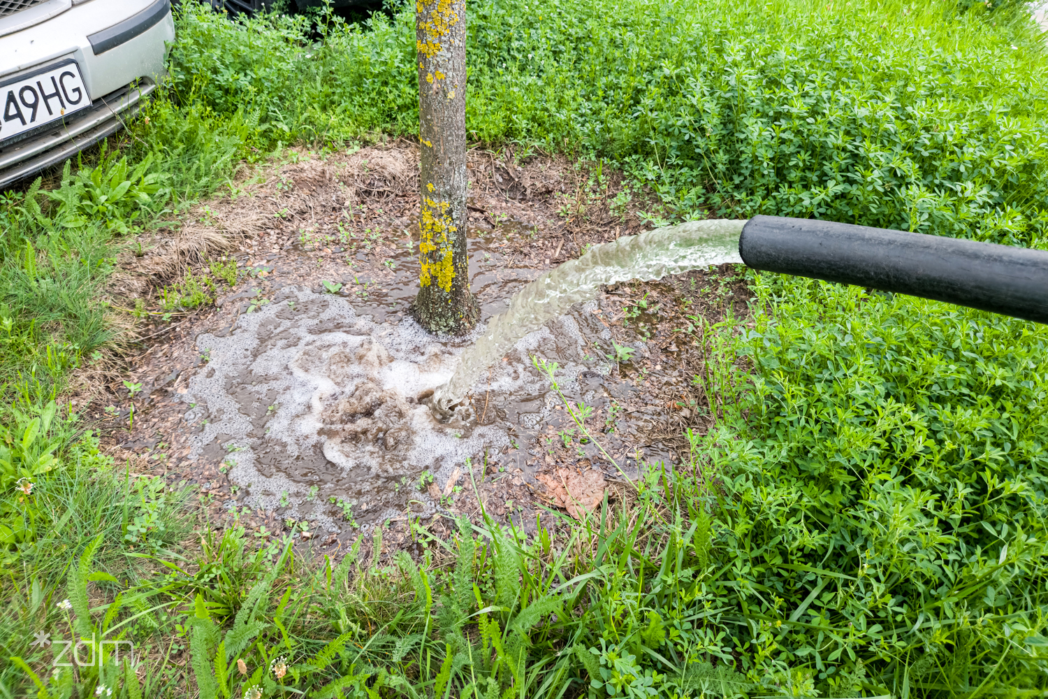 Paradoksalnie, najlepszy moment na podlewanie drzew to… właśnie wtedy, gdy pada. Zwilżona deszczem gleba w górnych warstwach pozwala wodzie z podlewania przeniknąć głębiej. A to właśnie głębokie zakorzenienie się drzew jest kluczowe dla ich stabilności i odporności na suszę. Celem zabiegów pielęgnacyjnych jest nie tylko „przetrwanie” roślin w przestrzeni miejskiej, ale ich długofalowy wzrost. Dlatego głębokość, na jaką dociera woda z podlewania jak i sposób jego wykonania ma ogromne znaczenie – i nie powinna być oceniana jedynie przez pryzmat tego, czy danego dnia padał deszcz.