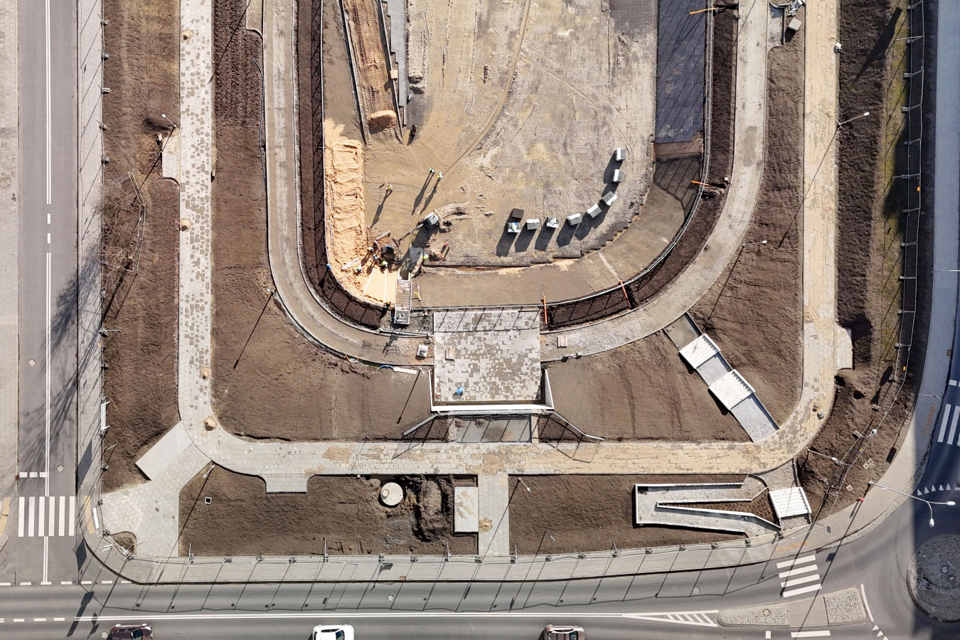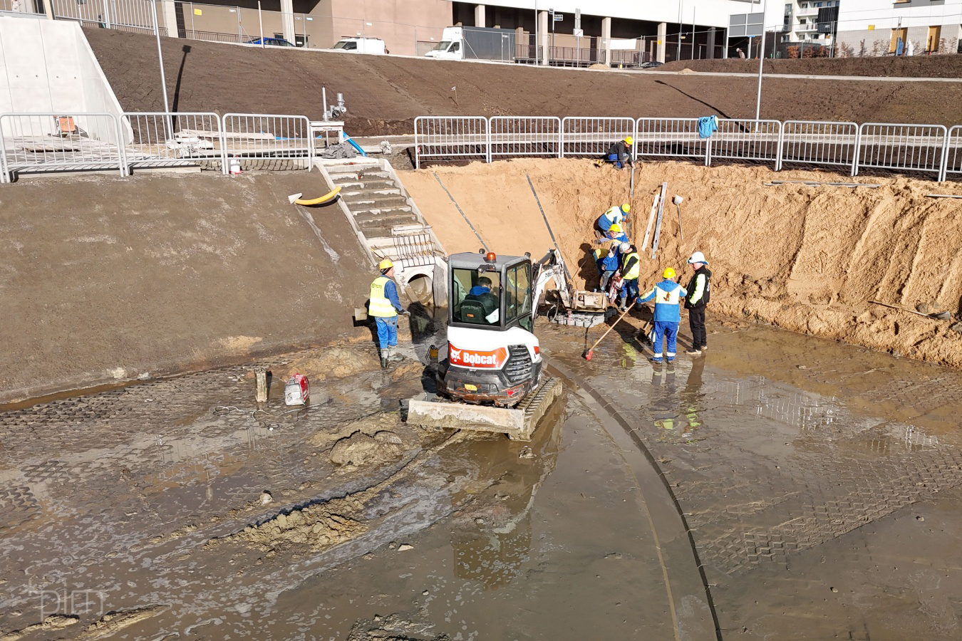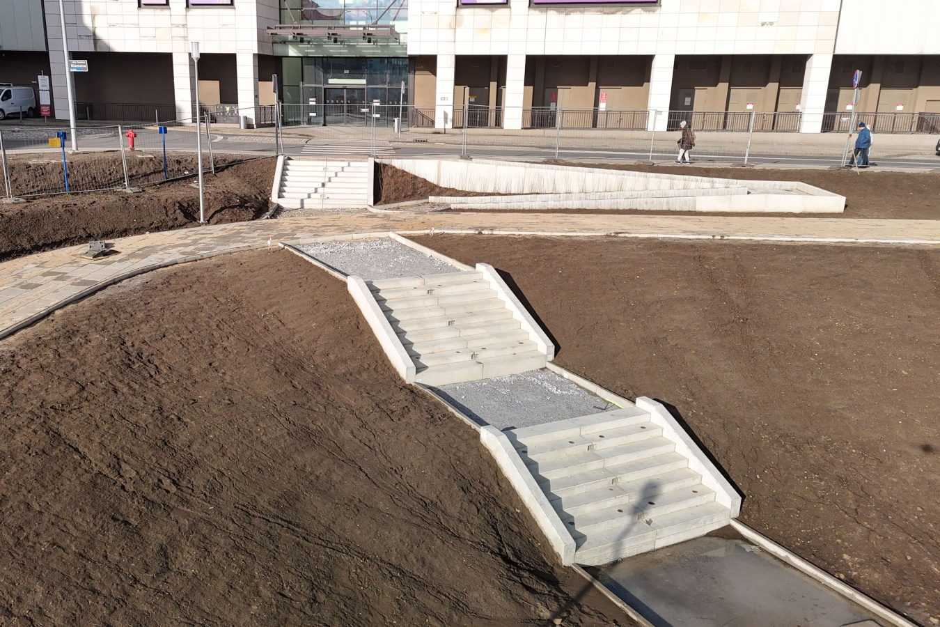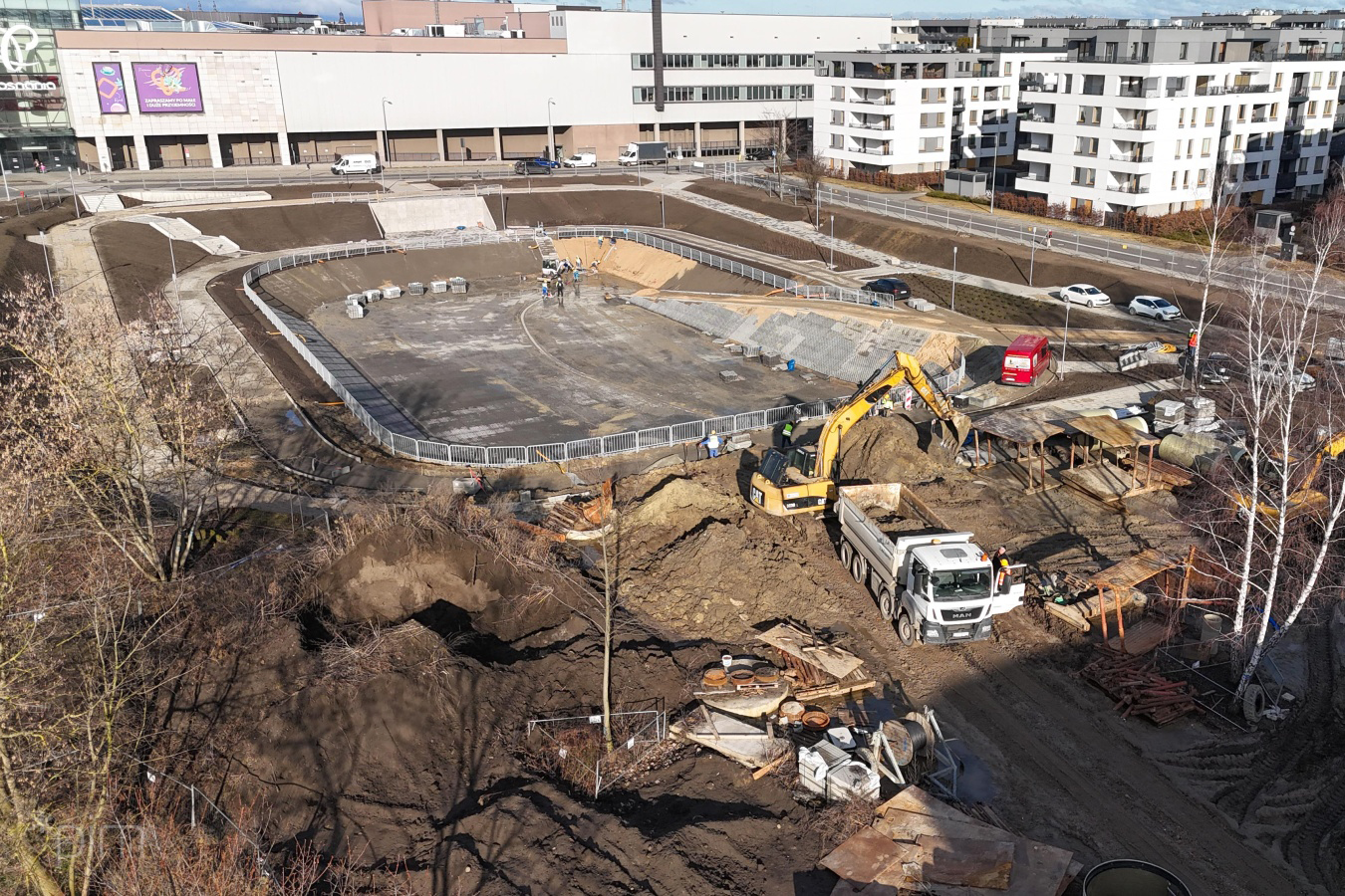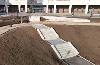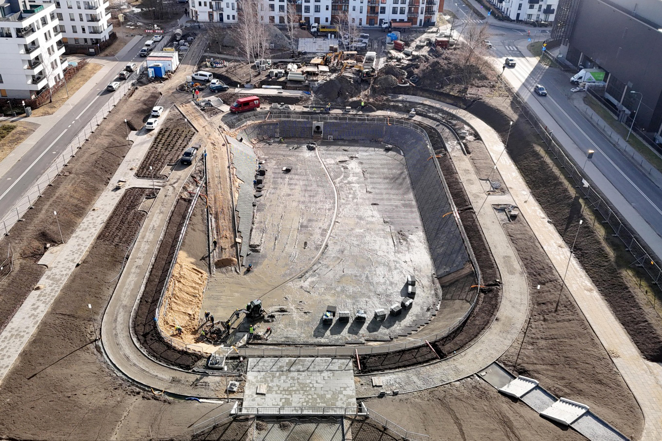 - Zbiornik retencyjny na Łacinie ma już docelowy kształt. Na dnie ułożone zostały płyty ażurowe, stopniowo pojawiają się też na skarpach. Chodnik na wyższym poziomie jest gotowy niemal na całym odcinku wokół zbiornika. Na niższym trwa budowa ścieżki, wzdłuż której aktualnie montowane są krawężniki. Widać też konstrukcje schodów łączących oba poziomy oraz technicznych, prowadzących na dno zbiornika. Na placu budowy możemy zauważyć też barierki i taras, na którym ułożone zostały płyty chodnikowe – wymienia Justyna Litka, prezes spółki Poznańskie Inwestycje Miejskie.