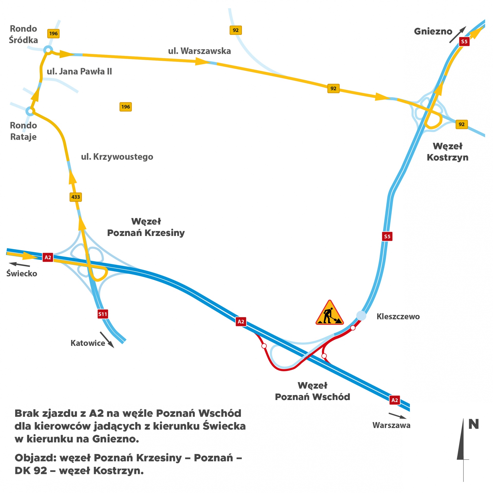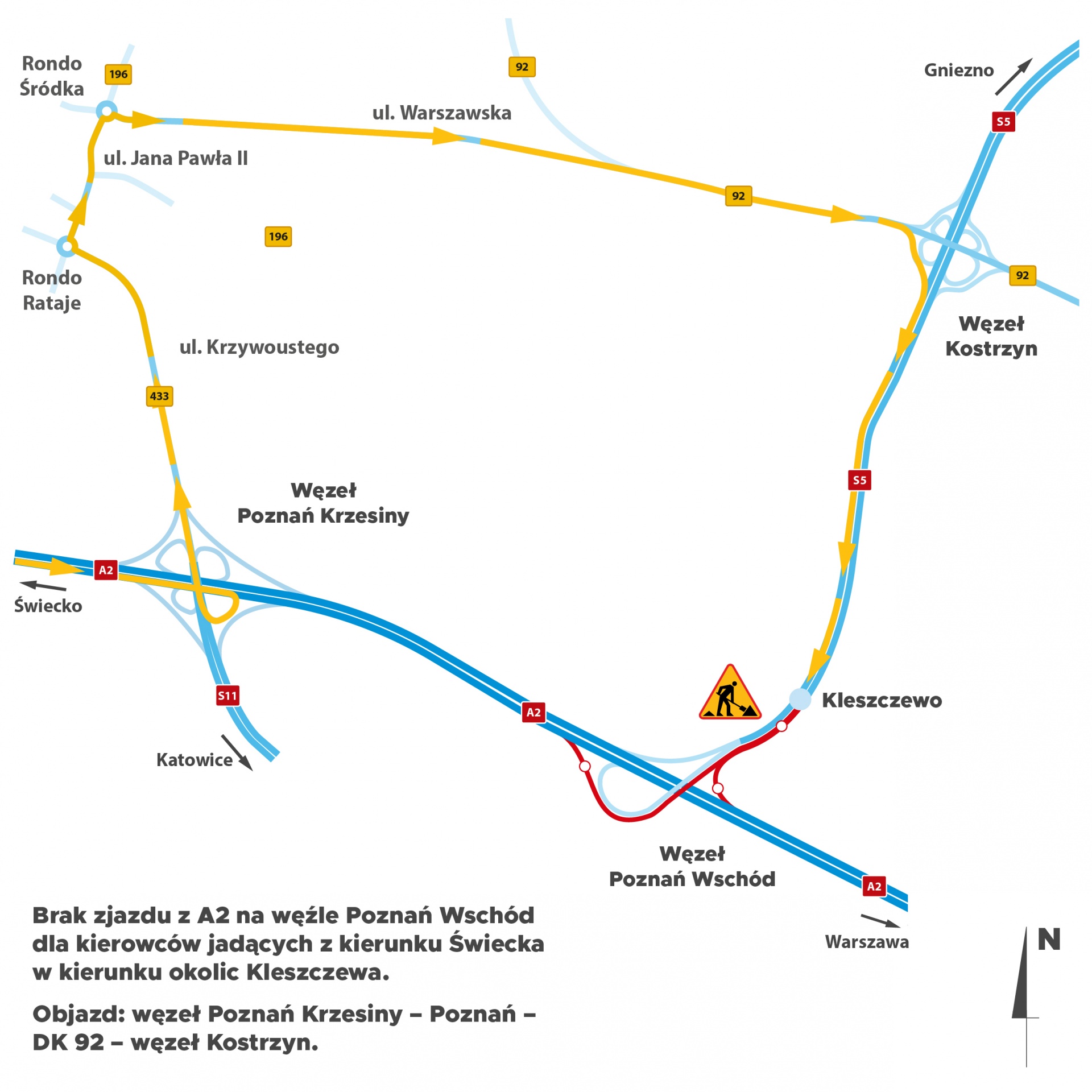 Podobnie w przypadku kierowców podróżujących z kierunku Świecka i chcących jechać w okolice Kleszczewa objazd zostanie poprowadzony od węzła Poznań Krzesiny, przez Poznań, DK92 do węzła Kostrzyn i dalej do Kleszczewa.