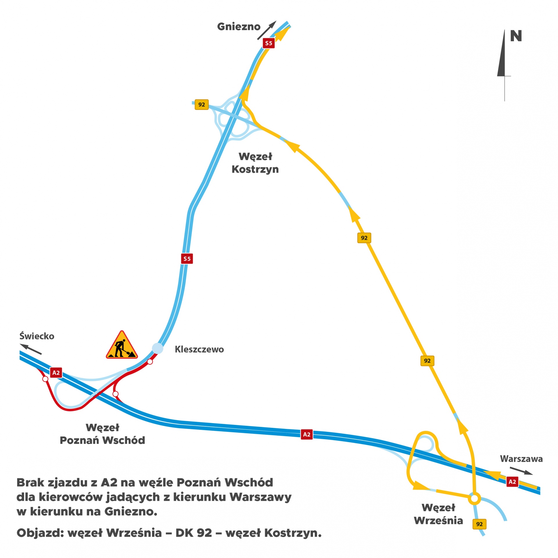 Dla kierowców jadących z kierunku Warszawy i chcących zjechać z A2 w kierunku Bydgoszczy/Gniezna objazd zostanie poprowadzony od węzła Września, drogą krajową DK92 do węzła Kostrzyn.