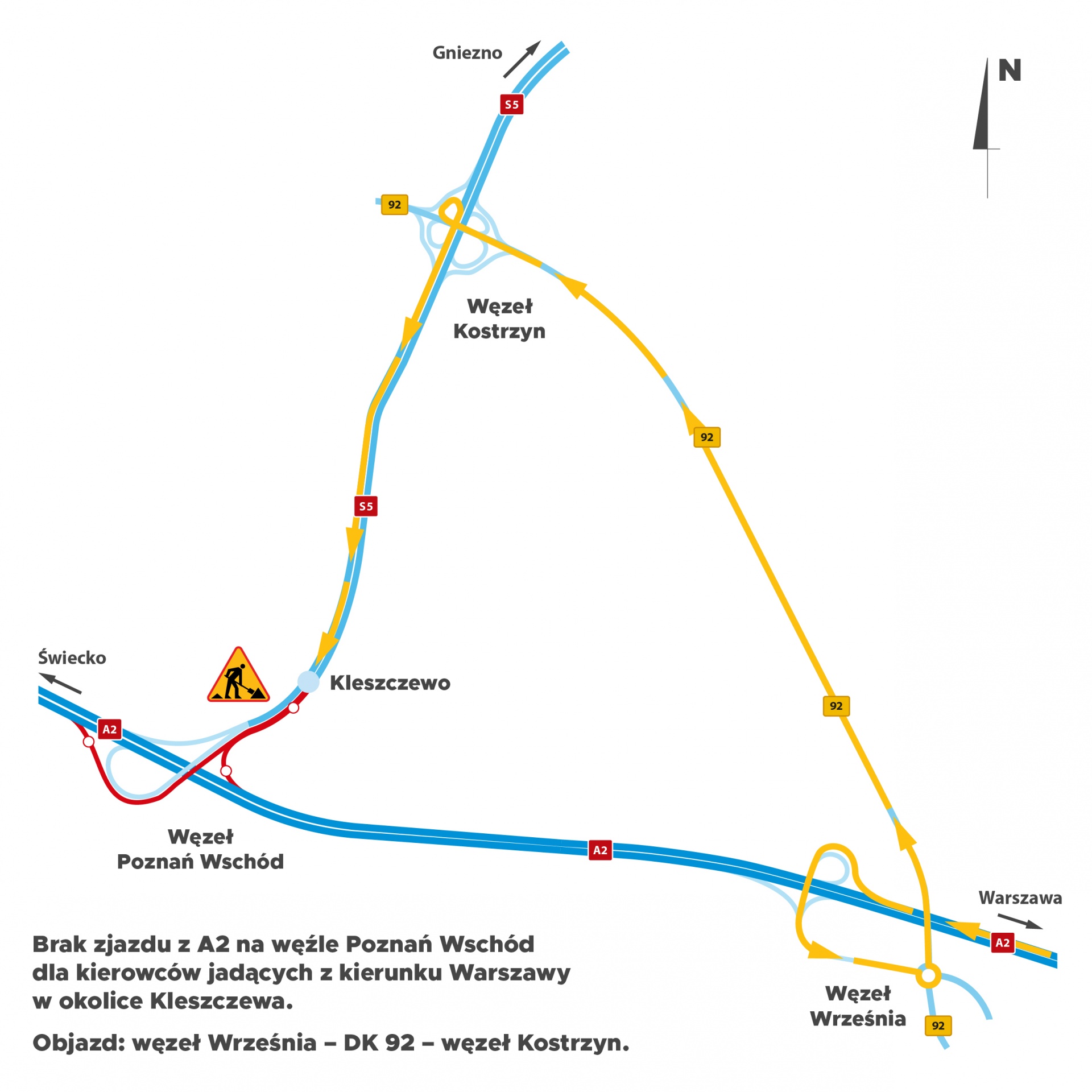Dla kierowców jadących z kierunku Warszawy w okolice Kleszczewa wytyczono objazd także od węzła Września, drogą krajową DK92 do węzła Kostrzyn i dalej do Kleszczewa