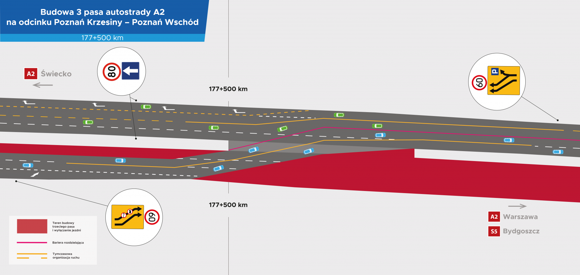 Dodatkowo, w rejonie węzła Poznań Wschód na jezdni głównej autostrady pomiędzy 177 a 180 km A2 ruch pojazdów zostanie całkowicie przełożony na jezdnię północną, na której zostaną wyznaczone po dwa pasy ruchu dla każdego kierunku.