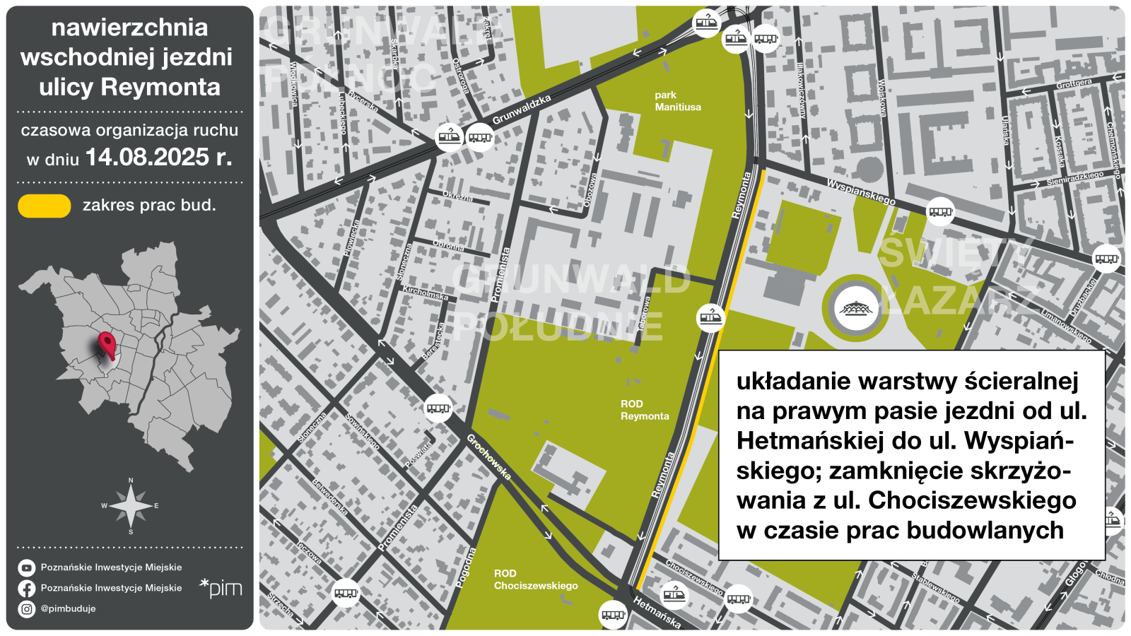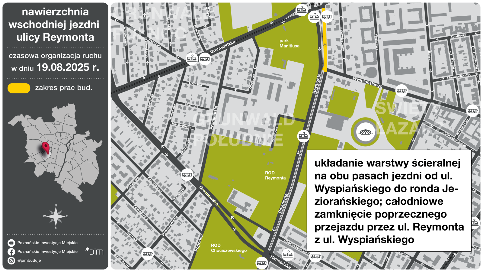 13 sierpnia (środa) warstwa ścieralna układana będzie na lewym pasie ul. Reymonta, na odcinku od okolicy ul. Chociszewskiego do ul. Wyspiańskiego. Następnego dnia (14 sierpnia) sytuacja się odwróci – prace prowadzone będą na prawym pasie, a pas szybki, o nowej nawierzchni, będzie przejezdny. 14 sierpnia konieczne będzie też wstrzymanie ruchu na skrzyżowaniu ul. Reymonta z ul. Chociszewskiego (od rana do ok. południa, czas trwania zależny od warunków atmosferycznych).