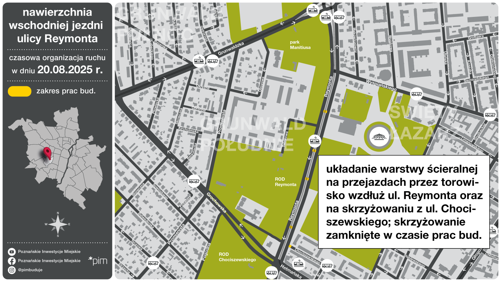 20 sierpnia prace nawierzchniowe prowadzone będą na skrzyżowaniu z ul. Chociszewskiego oraz na przejazdach przez torowisko wzdłuż ul. Reymonta. Wykonawca inwestycji planuje, że od rana do ok. południa zamknięte będzie skrzyżowanie z ul. Chociszewskiego (ostateczny czas trwania zależny od warunków atmosferycznych). Później prace będą wykonywane przy przejazdach przez torowisko.