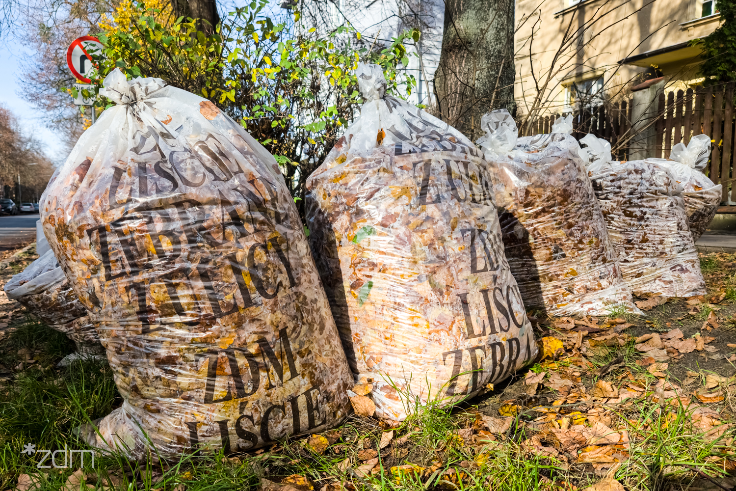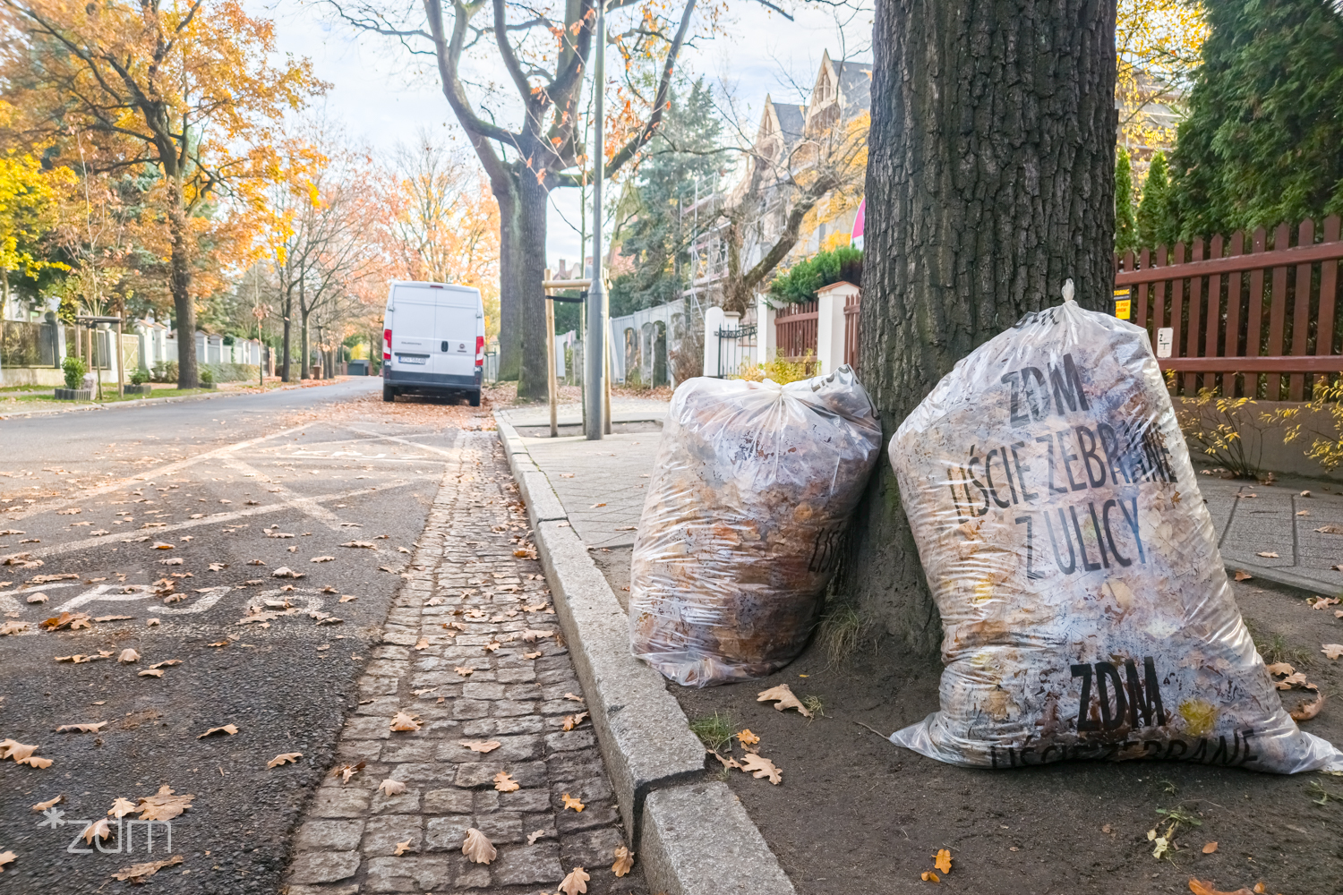 Zapełnione worki powinny być pozostawione w miejscu skąd liście były zbierane, na terenie ogólnodostępnym - na poboczu bądź na części chodnika, po stronie posesji.