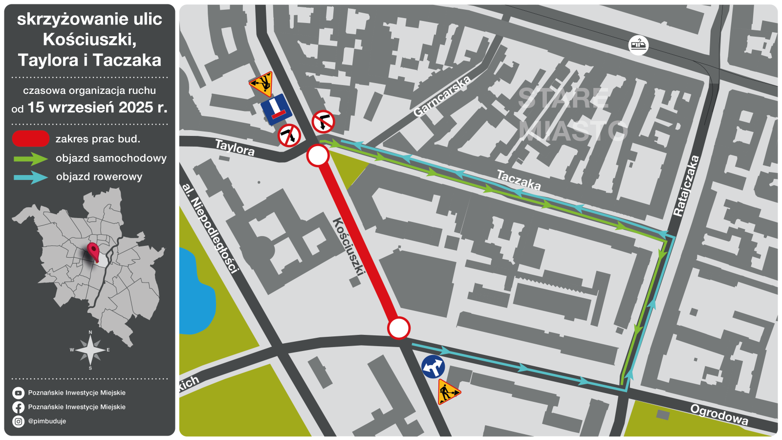 Wskazany odcinek ul. Kościuszki zostanie całkowicie zamknięty 15 września ze względu na ograniczoną przestrzeń, co ważne realizacja robót tzw. połówkowo wydłużyłaby czas prac. Dokładamy starań, by zostały zrealizowane jak najszybciej, w ciągu miesiąca, by ulica była przejezdna przed rozpoczęciem robót związanych z budową trasy tramwajowej w sąsiedniej ul. Ratajczaka.
