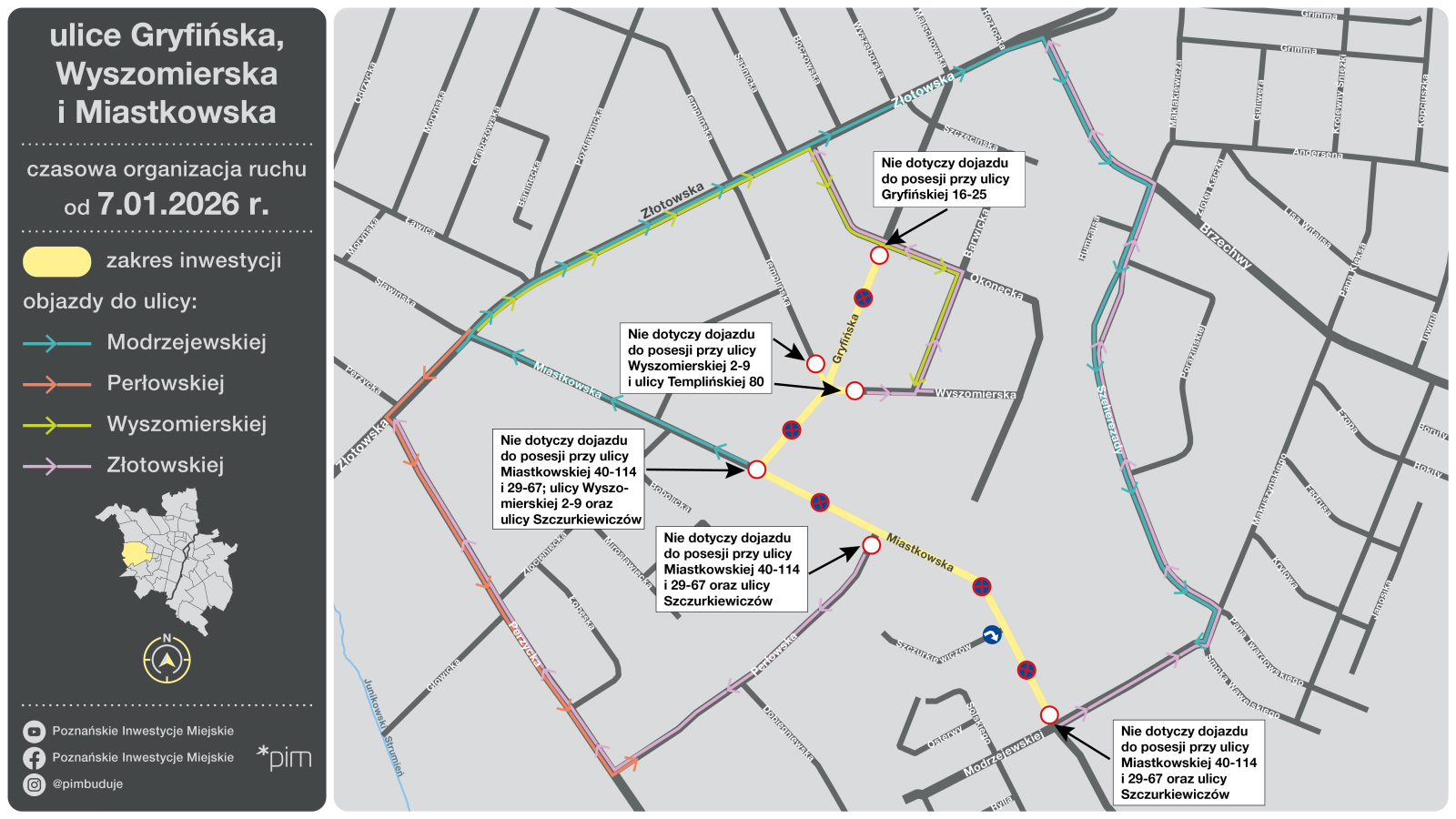 Od 7 stycznia będzie zamknięta ul. Wyszomierska między Miastkowską a ul. Gryfińską i Templińską wraz ze skrzyżowaniem tych ulic. W tym samym czasie wyłączona z ruchu zostanie ul. Gryfińska od wskazanego skrzyżowania do ul. Okoneckiej. Objazdy poprowadzone zostaną ulicami: Modrzejewskiej, Makuszyńskiego, Szeherezady, Brzechwy, Złotowską, Barwicką, Perzycką i Perłowską. Dostęp do posesji zostanie zachowany.