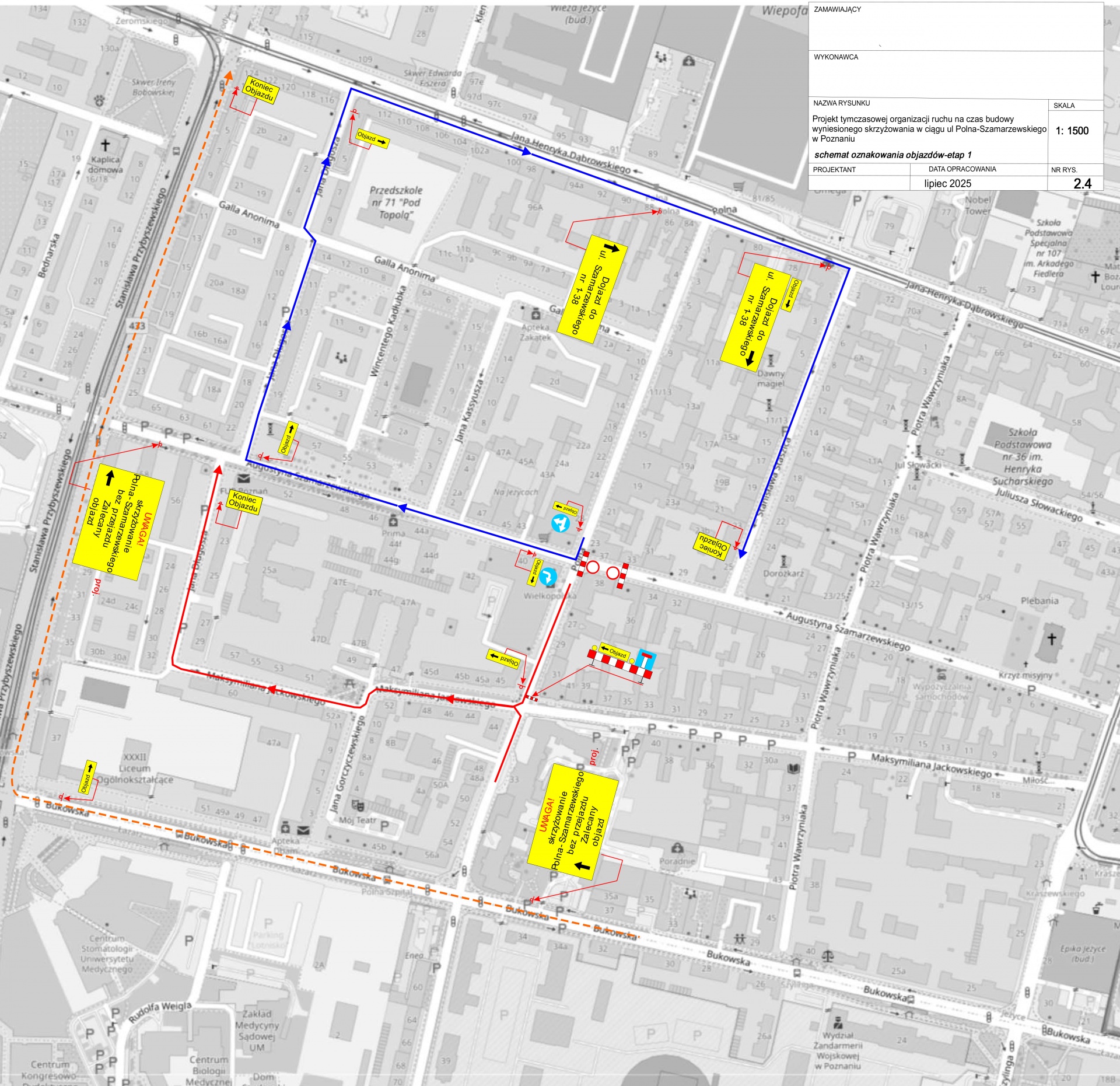 W pierwszym etapie, od 11 sierpnia, wygrodzenia obejmą wschodnią część skrzyżowania. Nie będzie wjazdu w ul. Szamarzewskiego w kierunku centrum. Objazd wyznaczono ul. Szamarzewskiego, Długosza, Dąbrowskiego i Staszica. Odcinek ul. Polnej od ul. Szamarzewskiego do ul. Jackowskiego będzie jednokierunkowy w stronę ul. Bukowskiej. Zalecany objazd: ul. Bukowską i Przybyszewskiego. Objazd lokalny ul. Jackowskiego (ze zmienionym kierunkiem ruchu) i ul. Długosza.