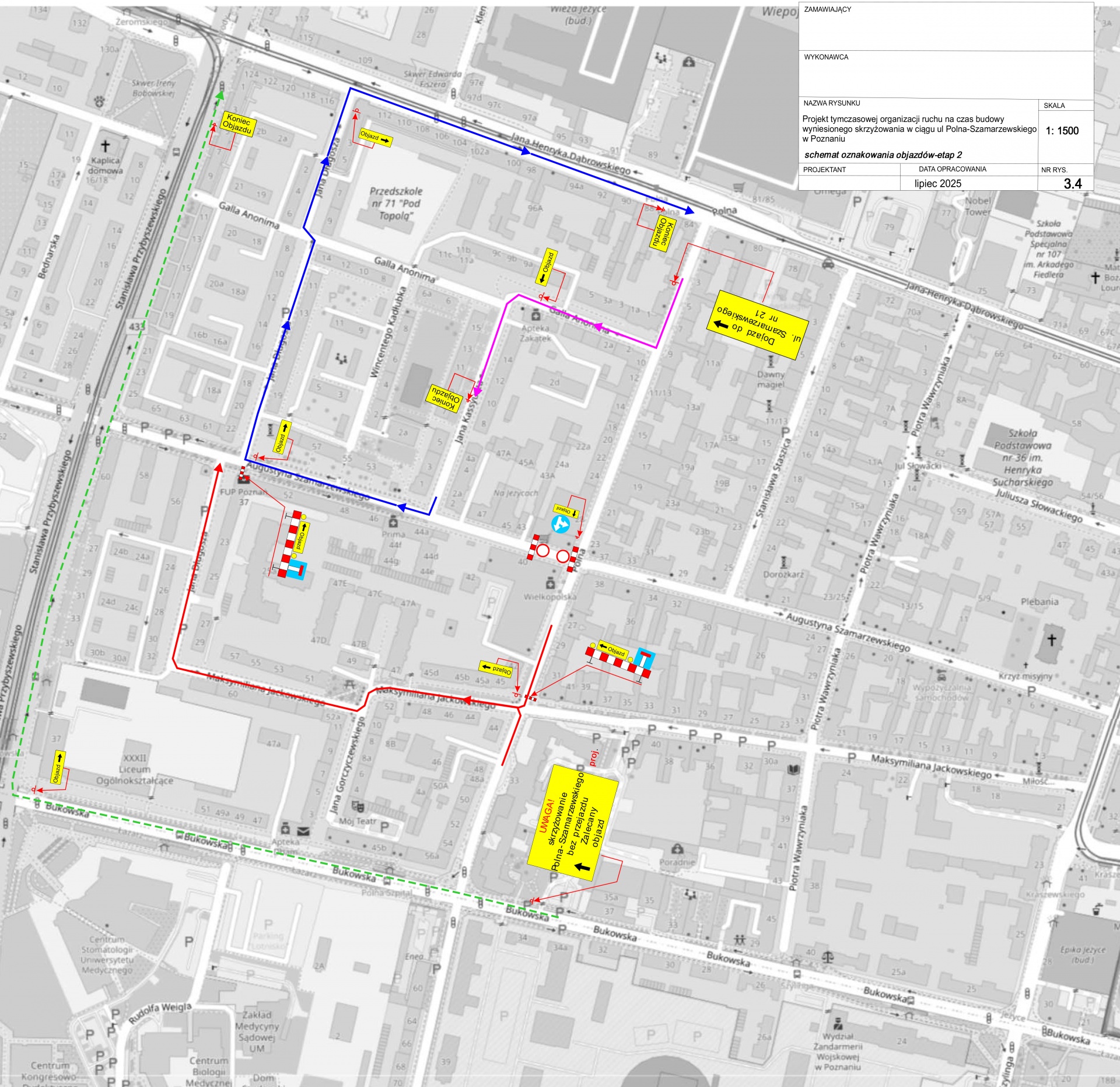 W drugim etapie wygrodzenia obejmą zachodnią część skrzyżowania i wylot z ul. Szamarzewskiego w ul. Polną. Objazd wyznaczono ulicami: Galla Anonima, Jana Kassyusza, Szamarzewskiego, Długosza i Dąbrowskiego. Odcinek ul. Polnej od ul. Szamarzewskiego do ul. Jackowskiego pozostanie jednokierunkowy w stronę ul. Bukowskiej. Utrzymane zostaną dotychczasowe objazdy tego odcinka.