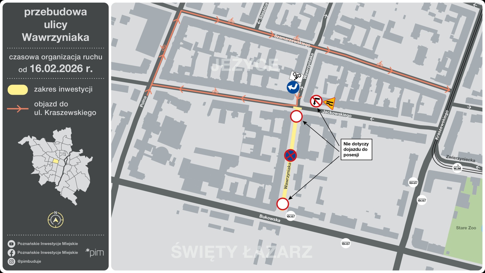 Aby umożliwić rozpoczęcie prac rozbiórkowych ulica Wawrzyniaka na przebudowywanym odcinku zostanie zamknięta dla ruchu kołowego, a piesi będą mogli poruszać się chodnikiem po wschodniej stronie ulicy. Zakaz nie będzie dotyczył pojazdów służb miejskich, dojazdu do posesji oraz dojazdu do Sądu Rejonowego Poznań Grunwald i Jeżyce. Objazd do ul. Kraszewskiego zostanie poprowadzony ulicami Jackowskiego, Polną i Szamarzewskiego.