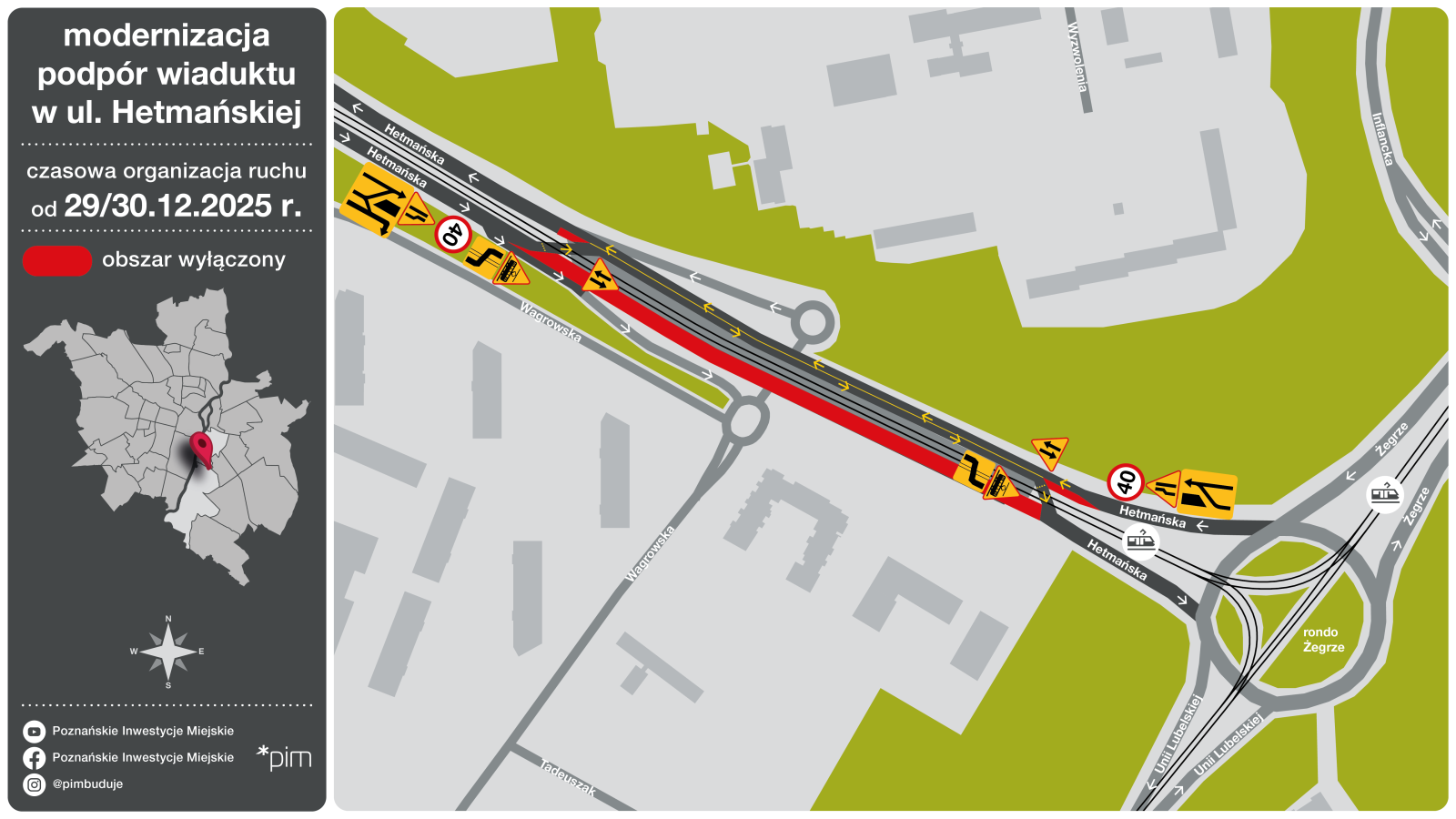 Dla kierowców zmiana oznacza, że wyłączona z ruchu zostanie jezdnia południowa ul. Hetmańskiej, a przejazd po jednym pasie w obu kierunkach będzie możliwy północną częścią, tj. od strony os. Armii Krajowej. Poruszający się ul. Hetmańską w stronę ronda Żegrze przemieszczą się na drugą jezdnię przewiązkami, czyli tymczasowymi przejazdami przez torowisko tramwajowe znajdującymi się po obu stronach wiaduktu. W dalszym ciągu należy zachować szczególną ostrożność przy pokonywaniu torowiska i bezwzględnie ustępować tramwajom. Ze względów bezpieczeństwa w rejonie prac nadal będzie obowiązywało ograniczenie prędkości do 40 km na godz. Prosimy o zachowanie ostrożności i zwracanie uwagi na oznakowanie. W dalszym ciągu wyłączona z ruchu samochodowego będzie ul. Wagrowska bezpośrednio pod wiaduktem, ciąg pieszo-rowerowy pozostanie zachowany.