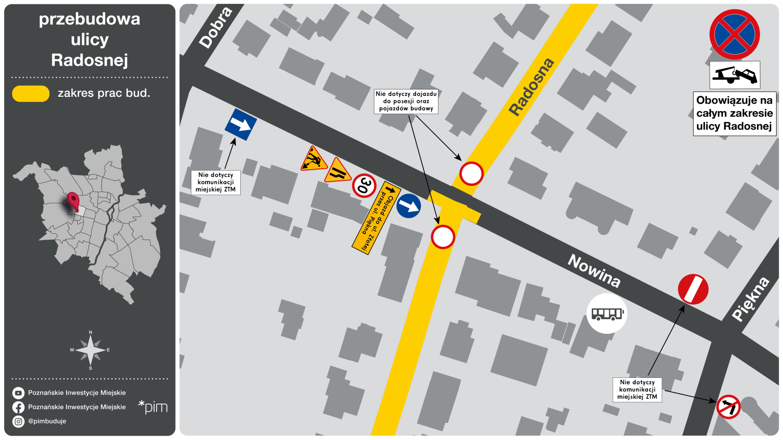 Wjazd w ul. Radosną na tym skrzyżowaniu nie będzie możliwy, objazd wyznaczony zostanie ul. Dobrą. Z kolei piesi kierujący się do szkół powinni korzystać z dojścia od strony ul. Pięknej.
