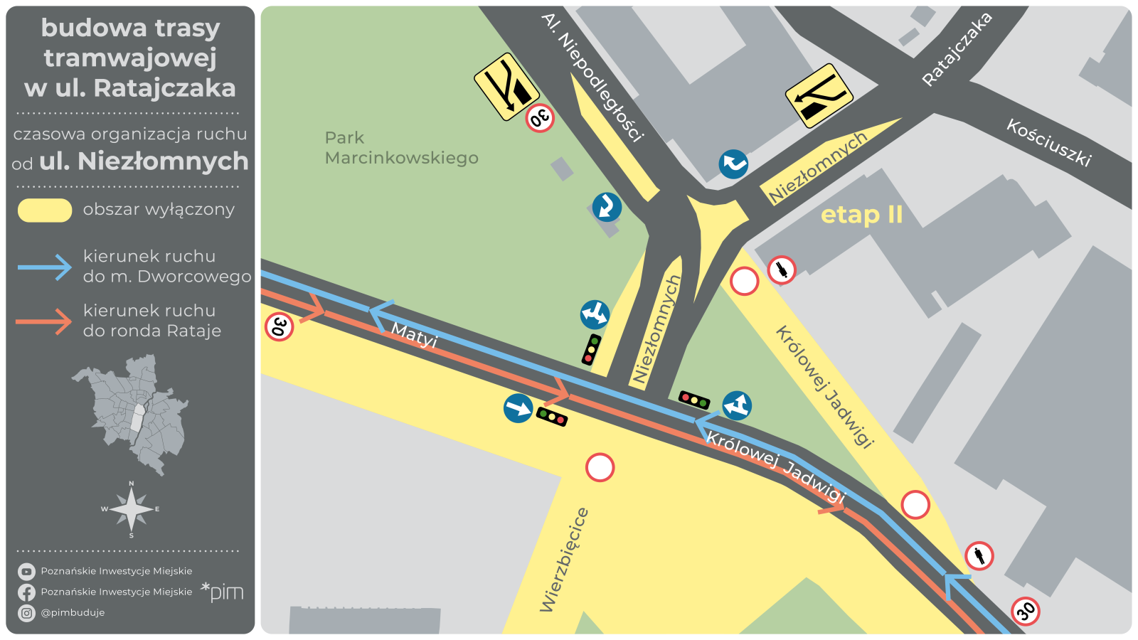 Przesunięcie wygrodzeń pozwoli na kontynuację robót związanych z kanalizacją. Do końca lutego zmian w układzie pasów ruchu będzie więcej, wprowadzane będą dynamicznie w zależności od postępu prac kanalizacyjnych. Oprócz korekty wygrodzeń konieczne będzie czasowe wyłączenie możliwości przejazdu na wprost ulicą Niezłomnych przez skrzyżowanie z Al. Niepodległości, będzie obowiązywał nakaz skrętu w prawo w Al. Niepodległości.