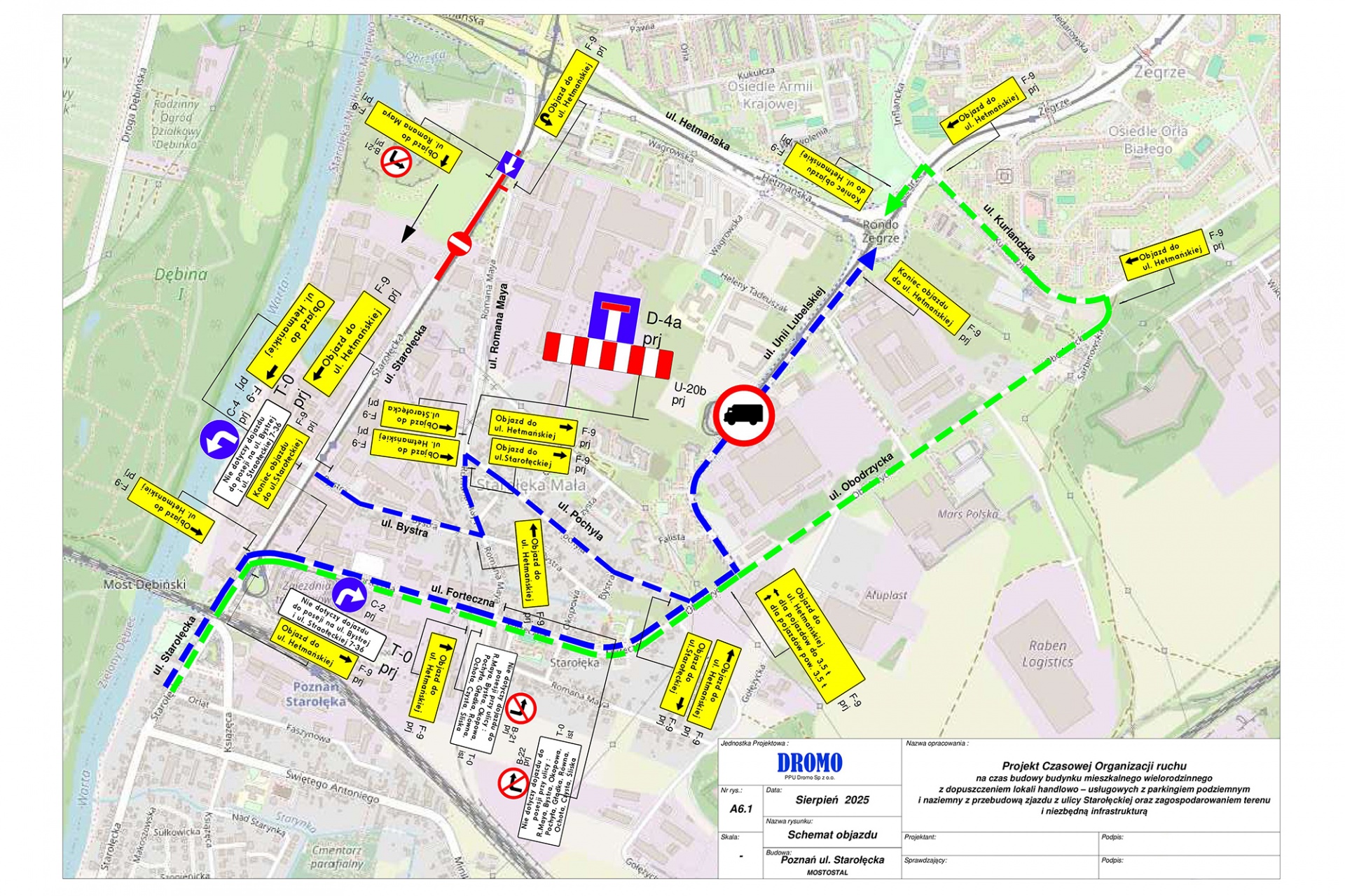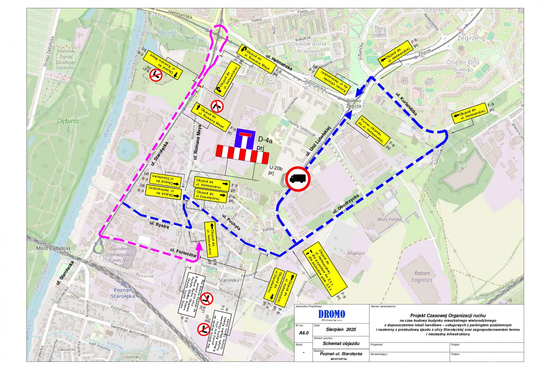 Od 10 sierpnia trwają prace związane z inwestycją budowlaną oraz remontami w jezdni i chodniku ulicy Starołęckiej, które prowadzi inwestor zewnętrzny. Na czas robót wprowadzona została tymczasowa organizacja ruchu. Po uzgodnieniach z wykonawcą Miejski Inżynier Ruchu zdecydował o wprowadzaniu korekt do projektu oraz uzupełnieniu oznakowania, w tym objazdów.