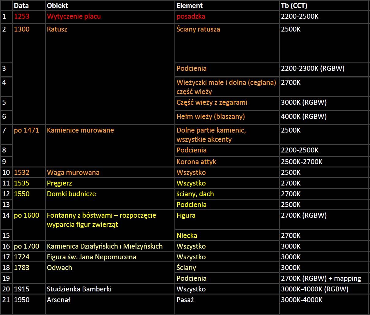 Wytyczne dla reguły historycznej temperatury barwowej, którymi kierowano się przy realizacji oświetlenia.